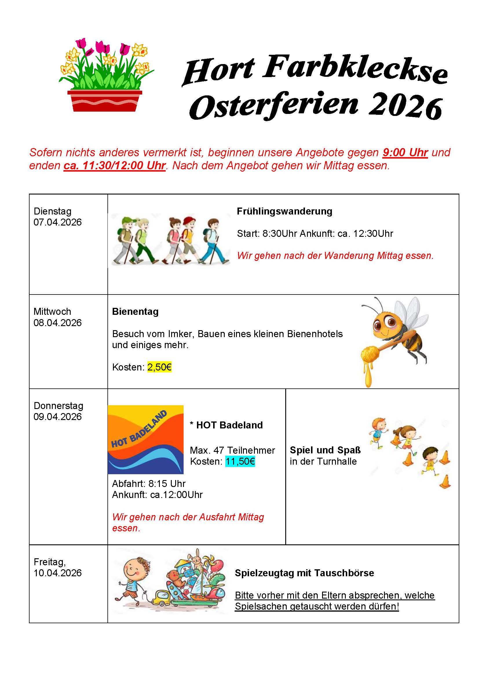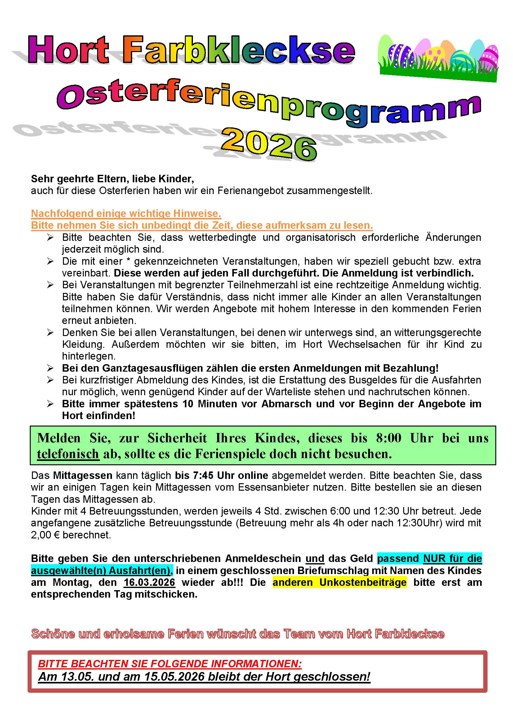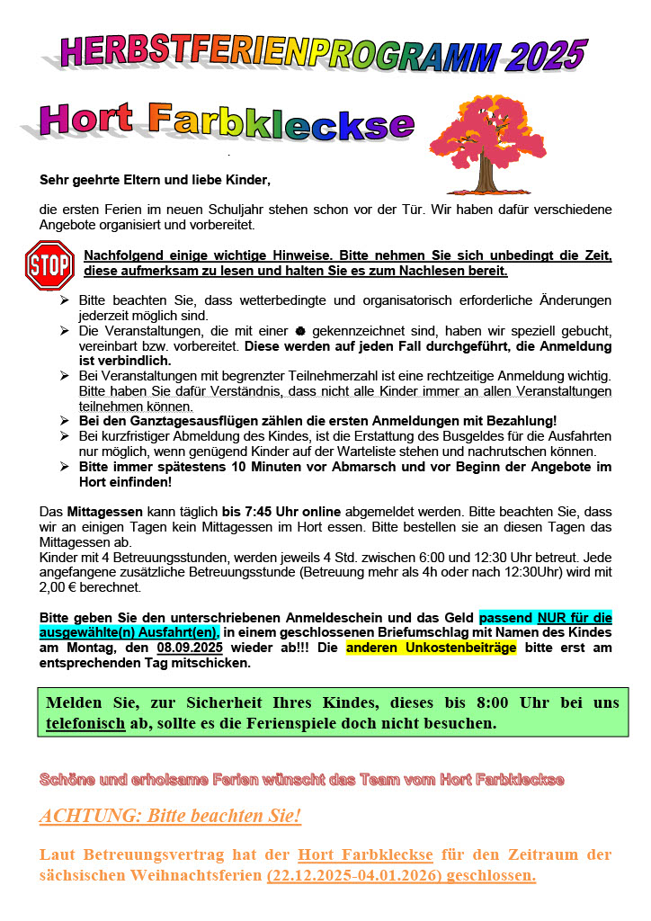 Der Hort Farbkleckse hat zu den folgenden Terminen geschlossen bzw. geänderte Öffnungszeiten: